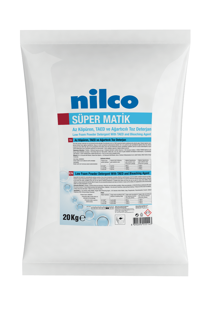 Слабопенлив прах за пране, съдържащ TAED и избелител 20 кг. Специално формулиран за автоматични перални машини. Благодарение на ензимите и TAED във формулата си, осигурява ефективност дори при ниски температури. Съдържа кислородна белина. Икономичен, екологичен и лесно биоразградим. При оптимална употреба съставките предпазват от вредното въздействие на водата, не увреждат прането и са икономични.